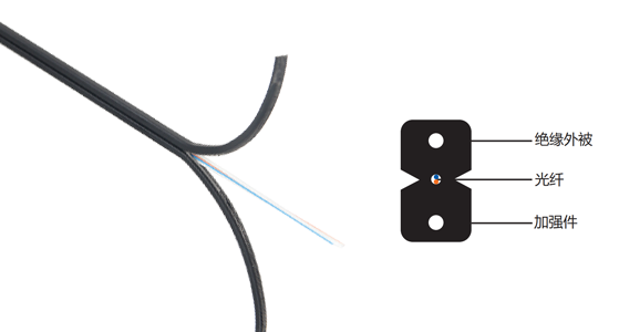 皮线光缆单芯,,,双芯结构应用较多,,也可做成四芯结构,,,,横截面呈8字型;加强件位于两圆中心,,,可采用金属或非金属结构,,,光纤位于8字型的几何中心。。。。